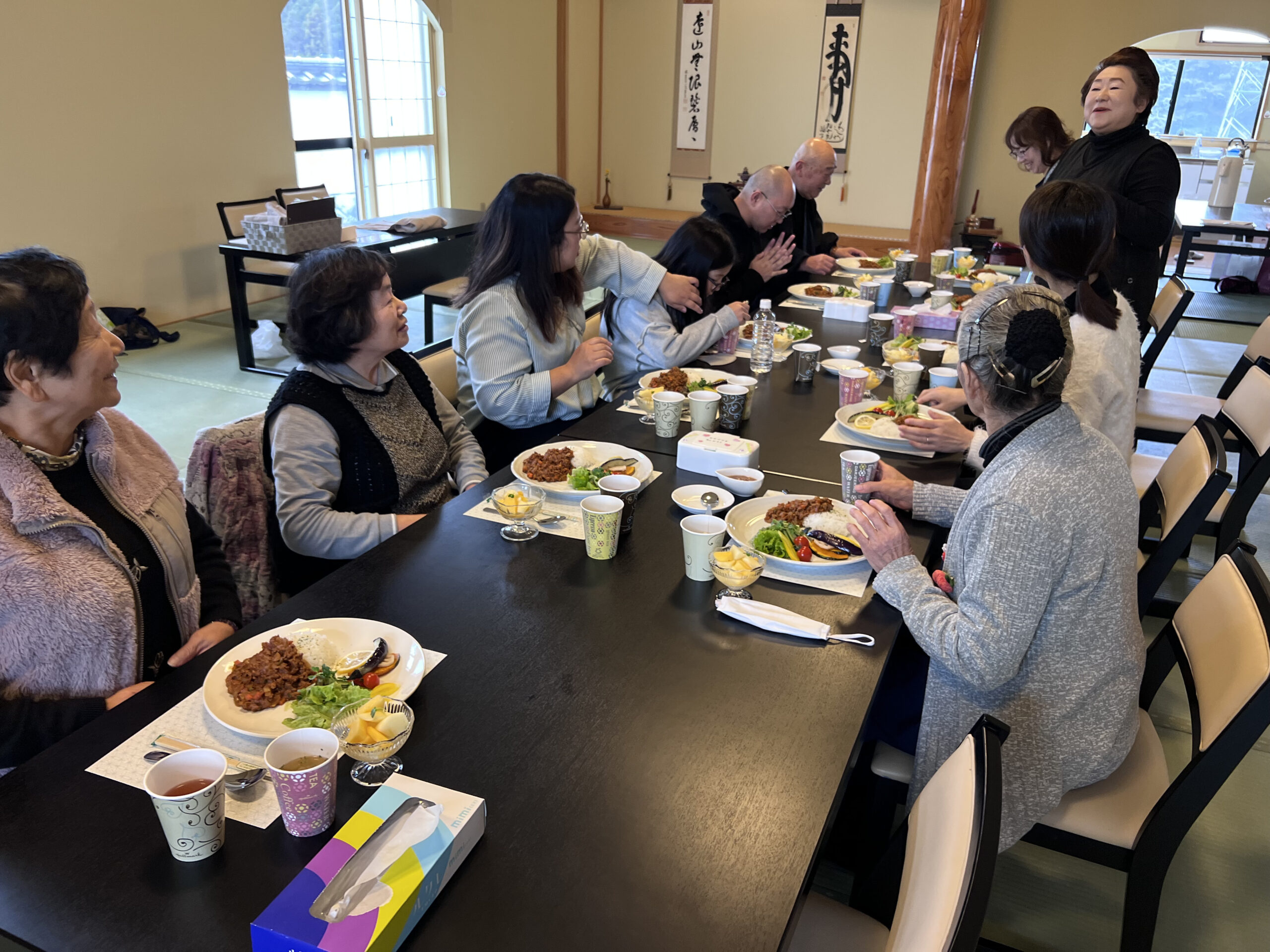 活動の後は、皆様と一緒に昼食を囲みました。 お寺の静かで凛とした空気の中でいただく食事は、心まで落ち着かせてくれます。同じ地域に住む同世代だからこそ通じ合える話題も多く、食事を終える頃には、会場全体が家族のような温かい雰囲気に包まれていました。