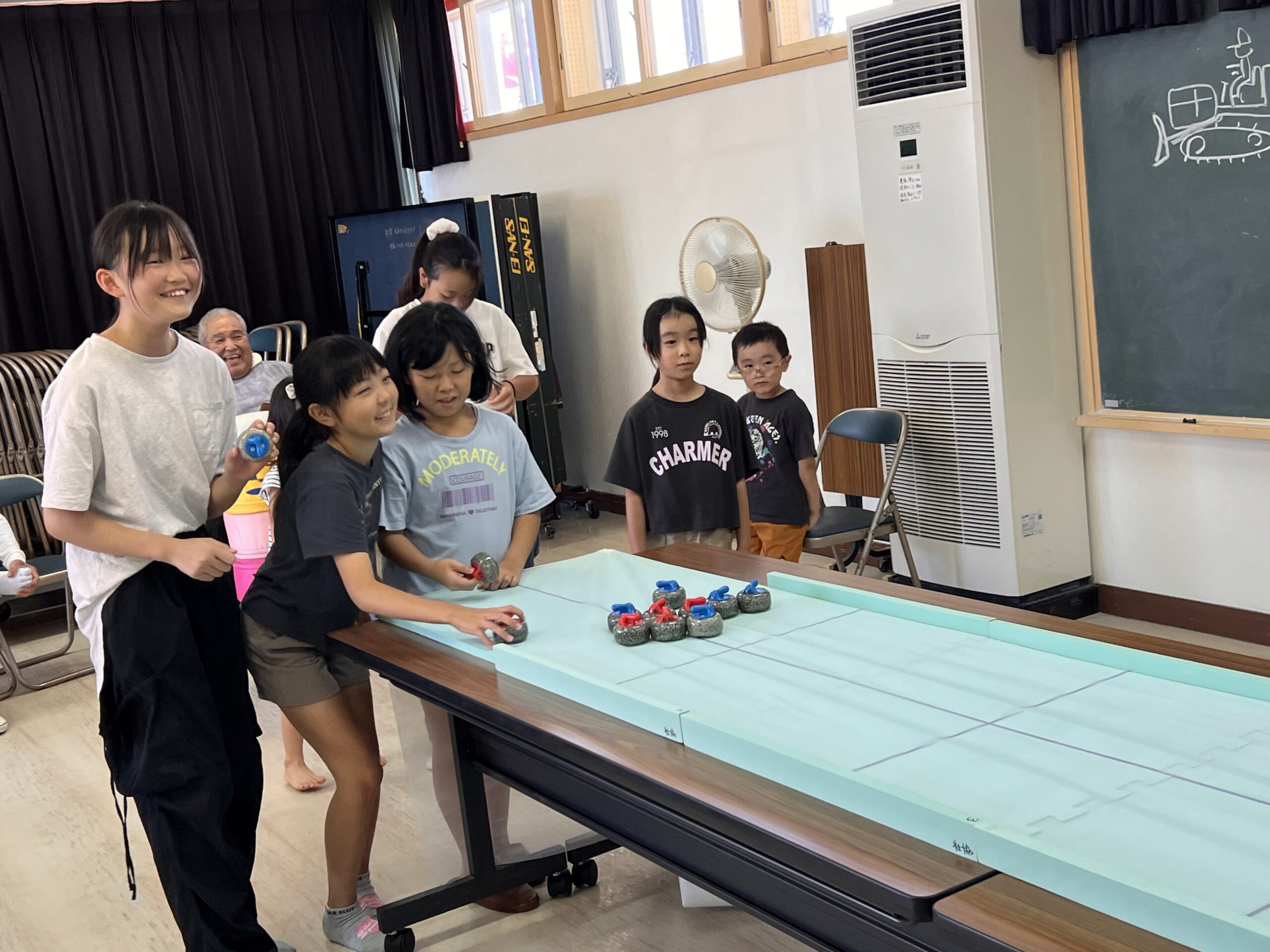 テーブルカーリング: シンプルながらも戦略が重要!「あー!惜しい!」「やったー!」と、世代を超えて白熱したバトルが繰り広げられました。