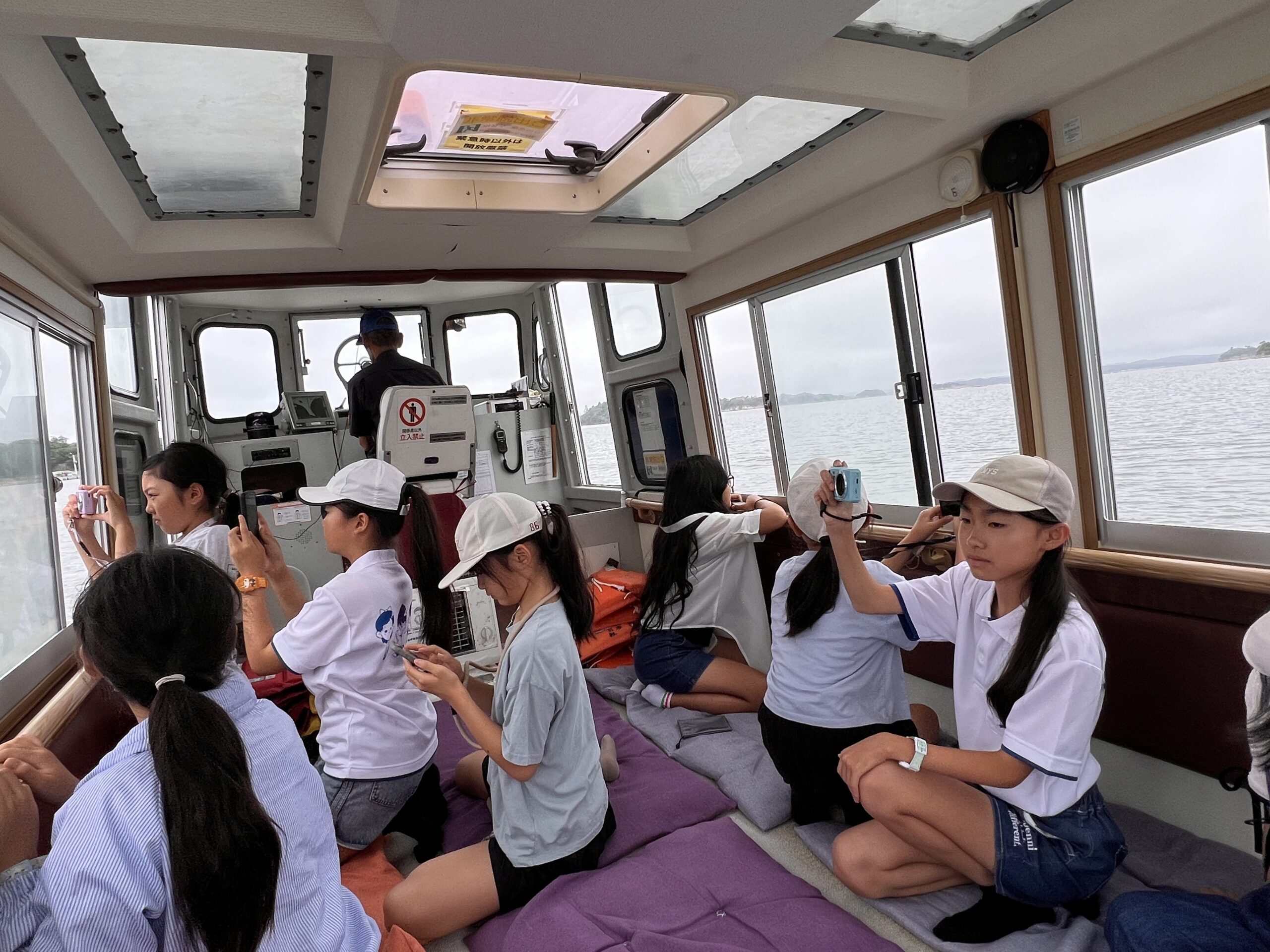 午後は、あおみなに向い、遊覧船に乗船して嵯峨渓を観覧しました。激しい揺れに耐えながらも、震災よって削られた岸壁や古くに使用されていた貝塚なども発見しました。