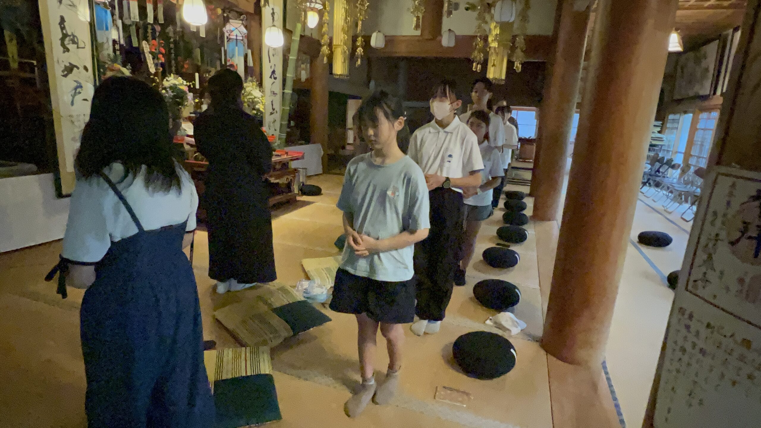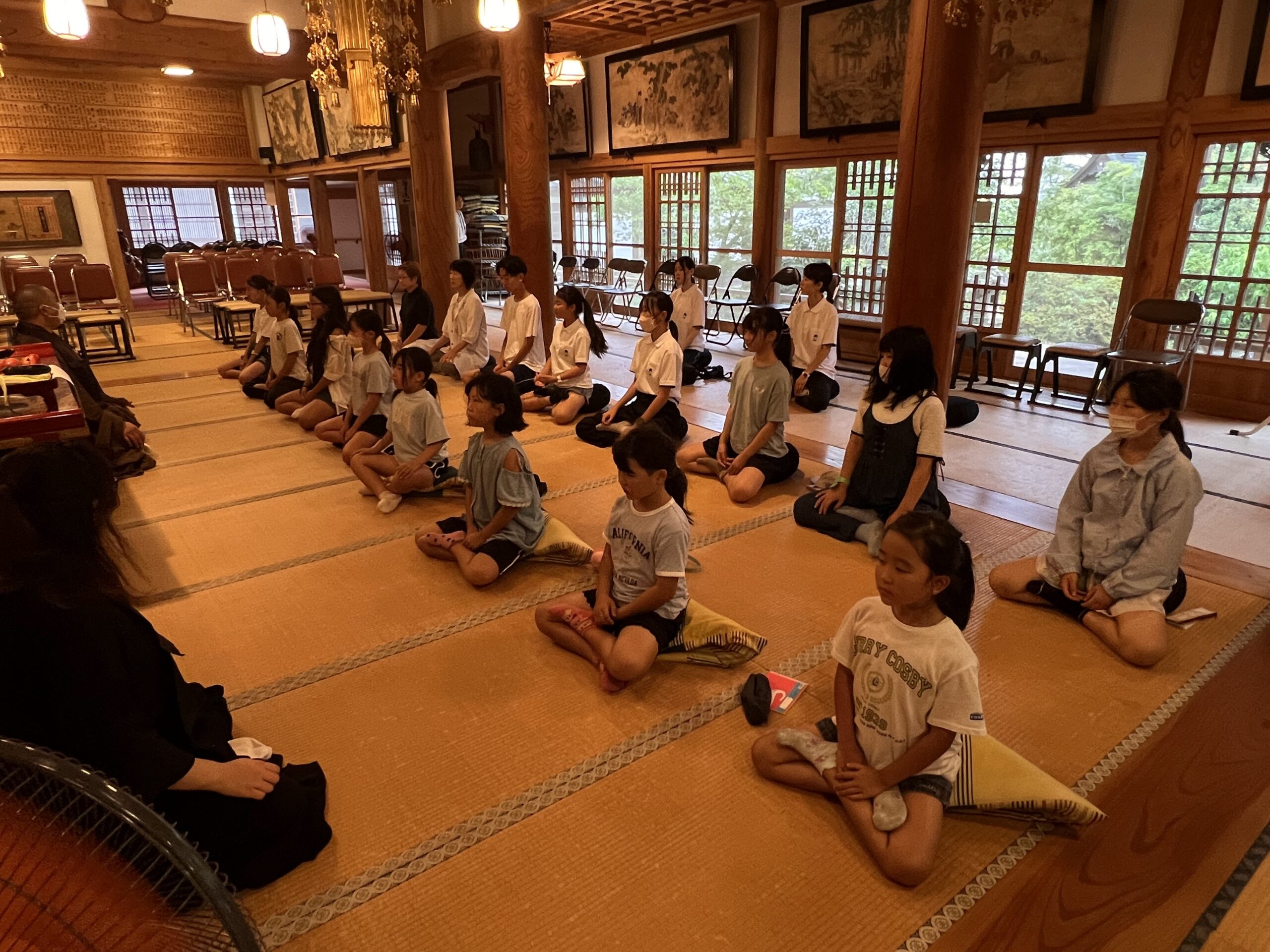 遊覧船での酔いを覚ました後、大塩地区にある清泰寺を訪問し、座禅体験をいたしました。「無」になることで集中力を高め精神を安定させるとして、こどもたちは正座で足を痺らせながらも、懸命に「無」になる時間をつくり精神を整えることに挑戦していました。