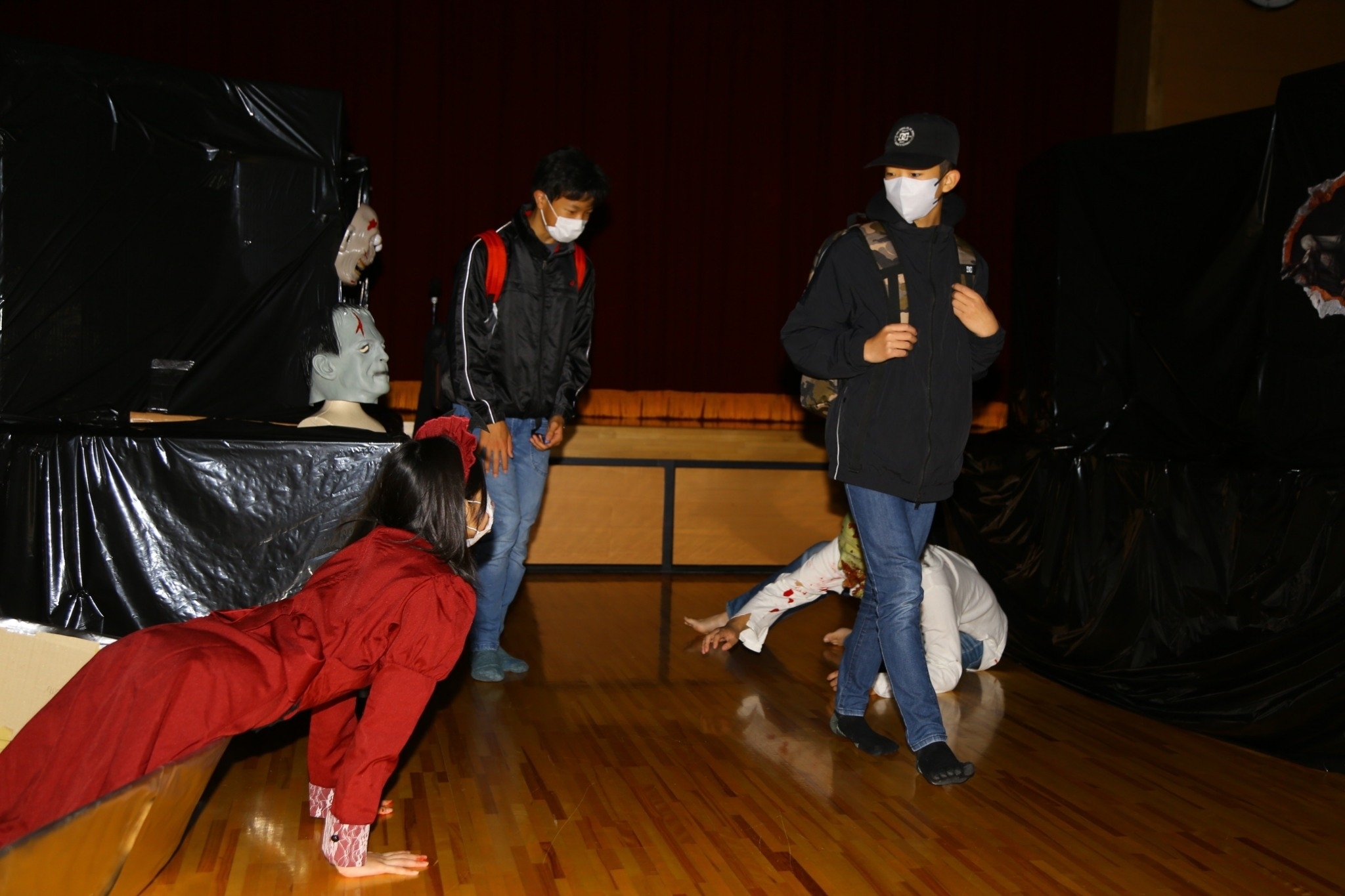 キャスト、誘導、しかけづくり等様々な役割に分かれ、おばけ屋敷を運営します。