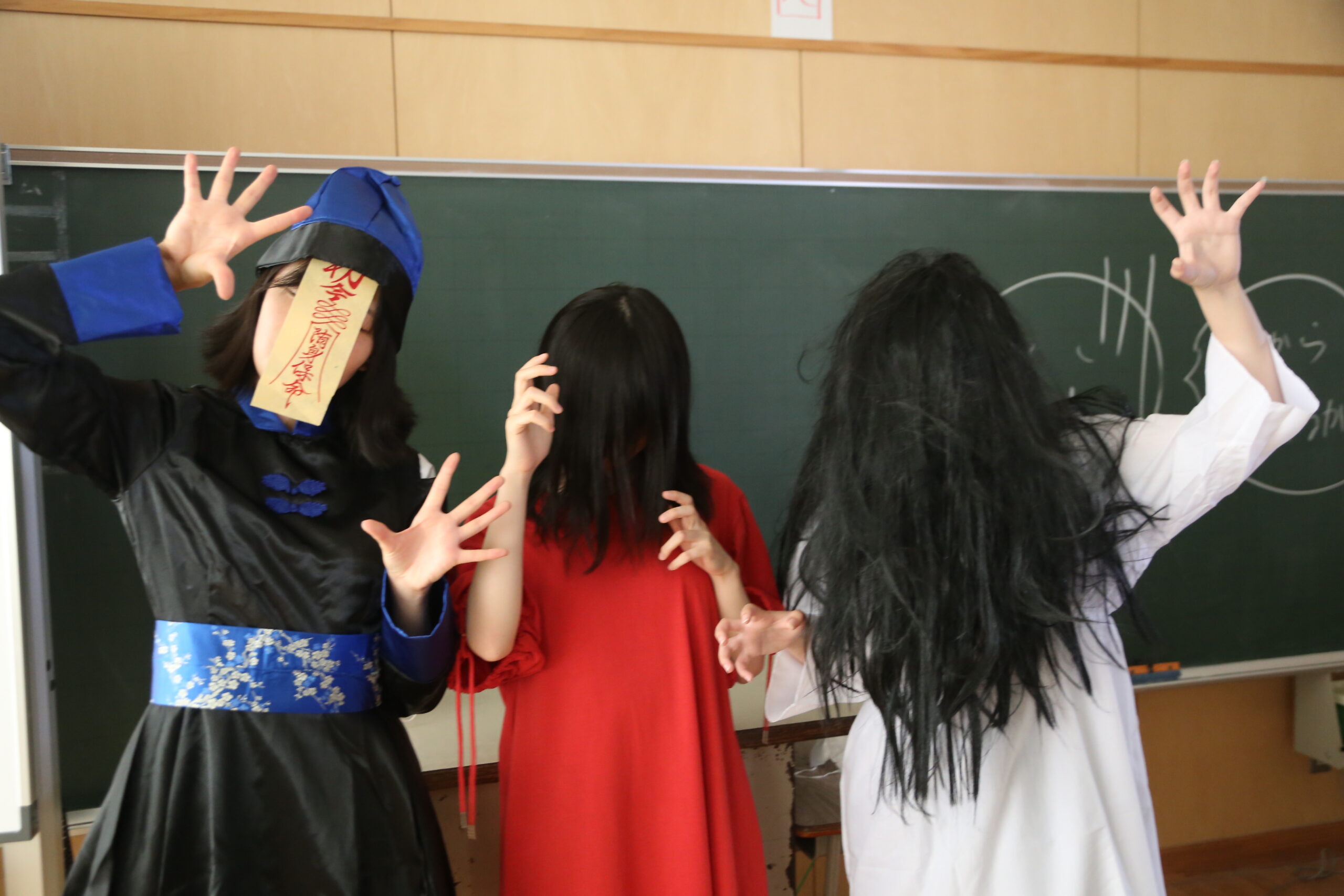 奥松島クラブハウスにて、「キョンシーの館」と題したおばけ屋敷を実施しました。子どもたちはお客さんに合わせた迫真の演技で驚かせ、突然のアクシデントに対する心理や対処法を考えながら実践しました。